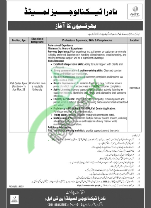 How to Apply for Call Center Agent in NADRA Technologies Limited Jobs 2026?